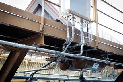 För att hålla trycket uppe finns en egen tryckluftsanläggning. Luftflödet är 72 liter per sekund genom kompressorn som levererar 61 liter per sekund från teknikrummet ut i systemet för att få ett tillräckligt sluttryck vid bromsarna. Det beräknade trycket i systemet är 16 bar men drifttrycket ska ligga på mellan 8,3 och 10 bar. En tank kan betjäna en eller flera bromsar oberoende. – Att tankarna är utomhus påverkar att beräkningstrycket för säkerhet måste ligga på 16 bar, även om drifttrycket ligger på max 10 bar, eftersom utetemperaturen påverkar trycket i systemet. 16 är ett värsta scenario – säkerhetsventilens öppningstryck på 12,5 bar ska lösa innan tanken smäller. Inne i teknikrummet kan det inte bli mer än 10 bar, berättar Elsa Wald, som bland annat gjorde beräkningarna för tryckluftssystemet.