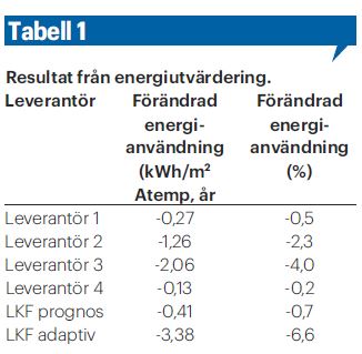 Under utvärderingen följdes energianvändningen under större delen av värmesäsongen för 2023–2024 (oktober–februari) och jämfördes med medelvärden för uppvärmning från 2019 till 2022. I tabell 1 redovisas alla värden, normalårskorrigerade och avser enbart uppvärmningsenergi. De två styrningsalternativen som visar en märkbar förändrad energianvändning är leverantör 3, där energianvändningen minskar med 4,0 procent, samt LKF adaptiv, där energianvändningen minskar med