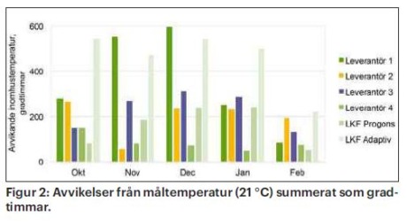 Om avvikelsen är mindre än ± 0,2 °C räknas den som 0. Samtliga avvikelser adderas till summan, oavsett om de är under eller över måltemperaturen. Leverantör 1 och LKF adaptiv avviker mest. Leverantör 1 har stor avvikelse på grund av att värmekurvan i fastigheterna var för låg, vilket leverantör 1, till skillnad från de andra, inte kunde kompenseras för. Att enbart använda adaptiv styrning utan prognosreglering (LKF adaptiv) visar sig vara minst effektivt när det gäller att bibehålla en jämn temperatur.
