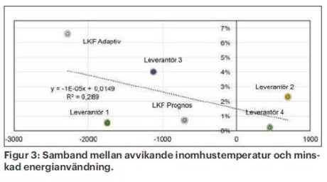 och energianvändningen. Här tas hänsyn till om avvikelsen är över eller under måltemperaturen. I figuren redovisas även en linjär interpolering med ekvation och hur väl interpoleringen överensstämmer med data (R2). Det låga R2-värdet visar att det inte finns ett tydligt samband mellan minskad energianvändning och lägre inomhustemperatur, även om det alternativ som minskade energianvändningen mest (LKF adaptiv) även var det alternativ som hade störst mängd negativa gradtimmar.