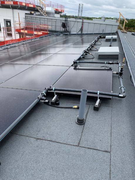 – 70–80 procent av takytan har tagits i anspråk för panelerna som utifrån ser ungefär ut som vanliga elsolcellspaneler. Eftersom panelerna värms av den omgivande lufttemperaturen kan vi hämta termisk energi även när solen inte lyser, säger Jon Svärd.