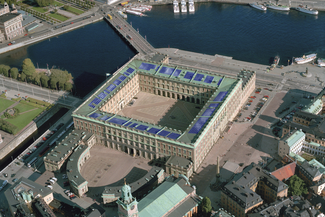 Att en kulturbyggnad av Stockholms slotts magnitud har solceller på taket är unikt i Sverige och mycket ovanligt globalt. Men helt i linje med kungens och regeringens ambition att visa att alla måste hjälpas åt för klimatets skull. Det ligger i tiden att skaffa solceller och ordna med egen el. Och då kan man bara hålla med om att solceller på Stockholms slott är helt rätt. Inte minst med tanke på konungens valspråk. Kung Carl XVI Gustaf ska själv ha varit aktiv i solcellernas tillkomst. Och det var en påtagligt nöjd monark som i april tog sig upp genom takluckan på Stockholms slott, för att personligen ta emot den 70-årspresent han för två år sedan utlovades av Statens fastighetsverk – 1 000 kvm solceller.