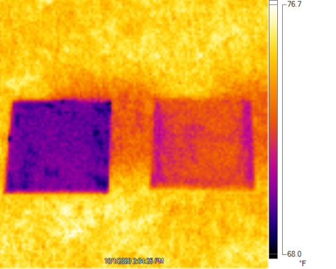 Värmekameran ger det visuella beviset. Två prov har målats vita, det ena med vanlig målarfärg, det andra med den solljusreflekterande färgen. De läggs på en yta på ett tak på universitetet och ganska snart står det klart att den nya färgen faktiskt är kallare än omgivningen.