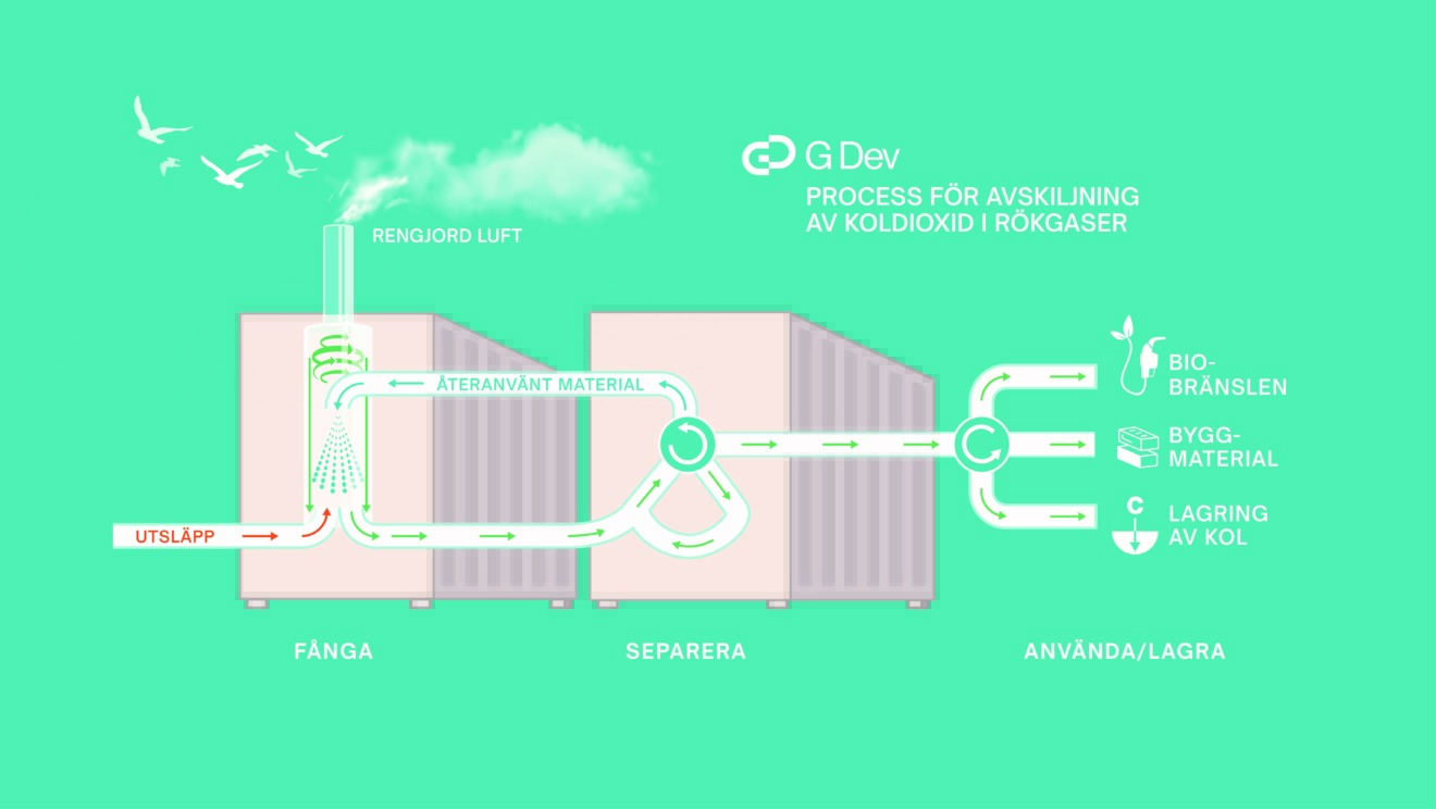 G Dev har utvecklat en teknik som förenklat går ut på att kombinera en spray- och centrifugalmetod för att fånga in koldioxidmolekylerna: en vätska som kan reagera med koldioxid sprayas in i rökgaserna från kraftvärmeverket. När de fina dropparna kommer i kontakt med rökgaserna, absorberar de koldioxiden. Därefter förs de koldioxidrika aerosoldropparna till en centrifug som separerar vätskan från gasen. Resterande rökgas (fri från koldioxid) släpps ut, medan vätskan regenereras – varpå koldioxiden avgår och omvandlas till flytande eller fast form.