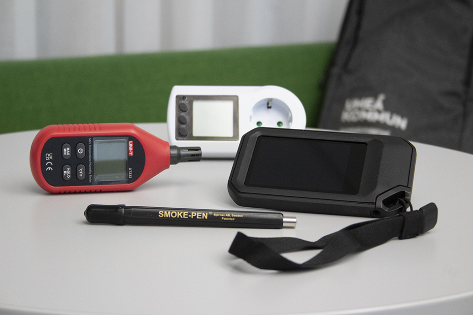 Energiväskan innehåller fyra mätverktyg: en hygrometer som visar temperatur och fuktighet i byggnaden, en rökpenna som används för att upptäcka drag, läckage och luftrörelser, en energimätare som enkelt kan kopplas till apparater för att mäta energiförbrukningen och en värmekamera som visar byggnaders värmeläckage.